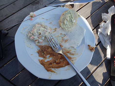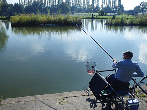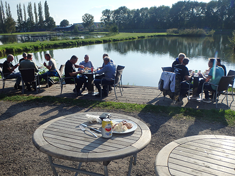 We zouden eigenlijk nog een uurtje door moeten kunnen vissen. Als we op de andere vijvers vissen dan eten we wat in het dorp. Voordat we daar zijn na een versnapering op de vijver en we klaar zijn met eten is de file al voorbij. Nu om zes uur duiken we er precies in en ben je weliswaar een uurtje eerder thuis maar wel dik twee uur in de auto gezeten.