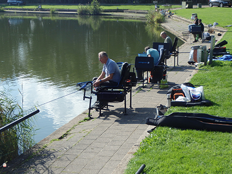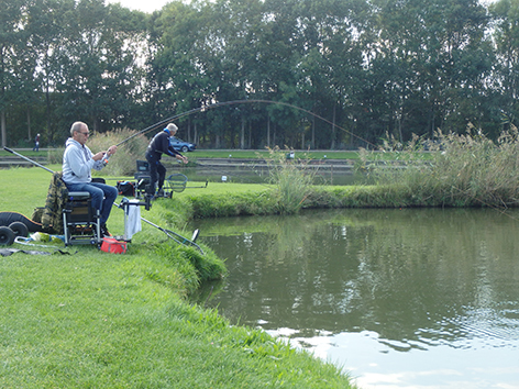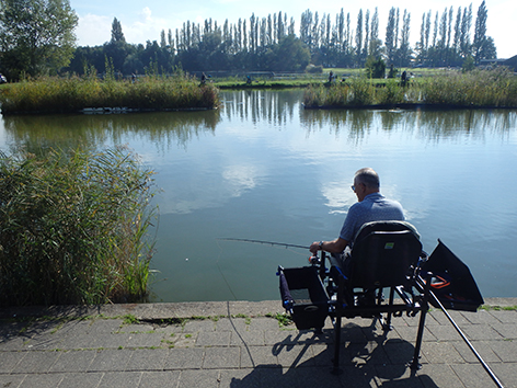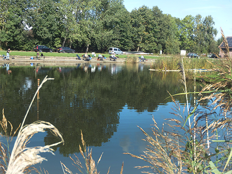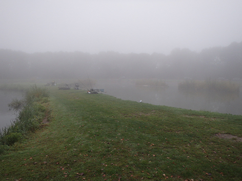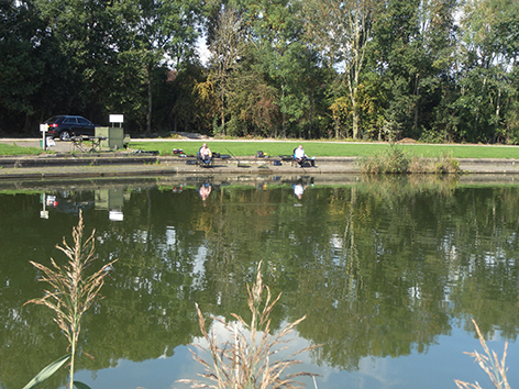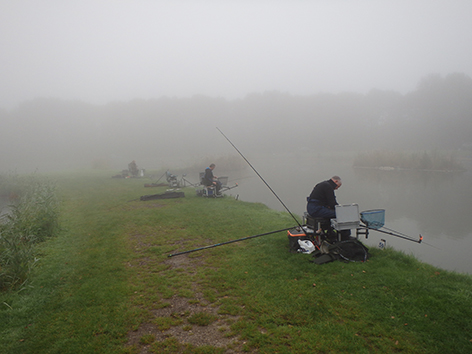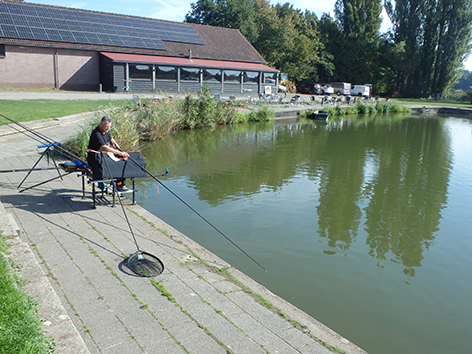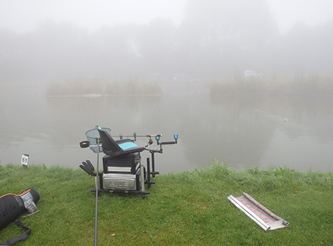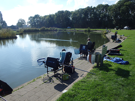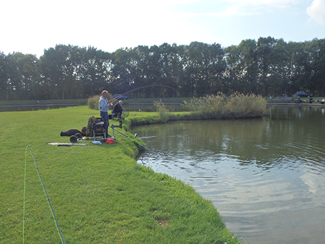 Bat speert gelijk naar nummer 58 waar ik de laatste keren heb gezeten, Arno en Piet vissen met de vaste stok er tegenover. Wij gaan toch weer aan deze kant van de vijver zitten zoals altijd. Ik zit vandaag tussen de twee eilandjes in op nummertje eenenzestig. Helemaal goed dus. Iedereen zet zijn spullen neer en gaat daarna aan de koffie met appeltaart.