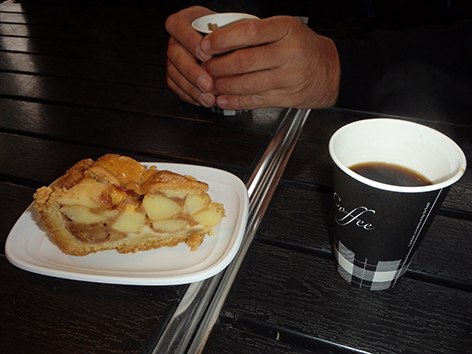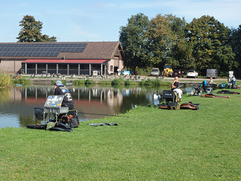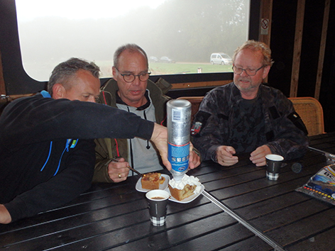 Iedereen zet zijn spullen neer waar die wilt gaan vissen en gaat daarna aan de koffie met appeltaart.