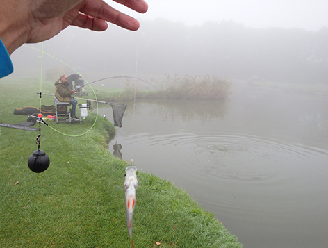 Ik moet mijn hengel nog uit het foedraal halen en kijken welke dobber ik gaat gebruiken. Als naast me Theo er al eentje heeft aan hangen. Ik kijk of het balletje langzaam wil zinken die ik gaat gebruiken. Maar wat doet die rare bewegingen maken. Als ik weer ophaalt hangt er een baarsje aan die zich vergiste in het elastiekje. Ondertussen kan Theo ook zijn vis netten en daar gaan we vandaag dus op vissen. Hij de eerste karper maar ik de eerste vis op de kant.