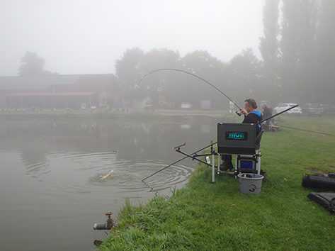 Na de lunch en mijn vijver ronde heb ik samen met Marco tegelijkertijd een vluchter aan de lijn. Toch maar weer proberen beide op de foto te zetten. Dat zijn toch de leukste plaatjes onder het vissen door. En deze keer trek ik aan het langste eind. Dat mag ook wel eens. Wat een vissen dat ik verspeelt heb vandaag. Ongelooflijk.