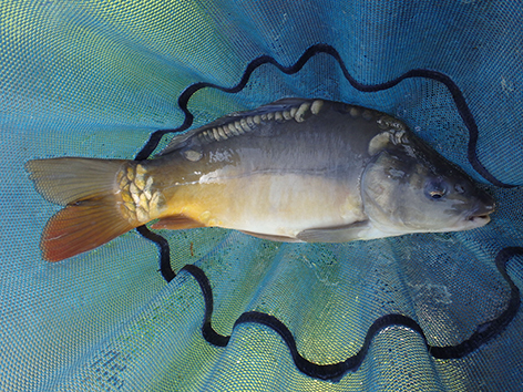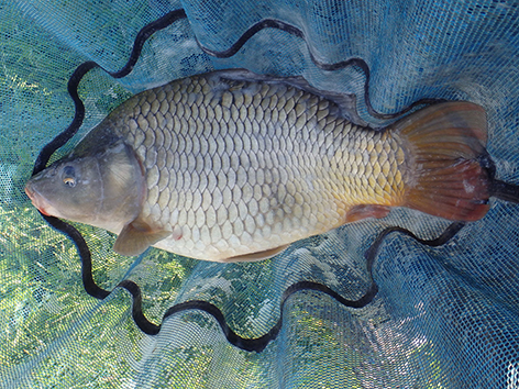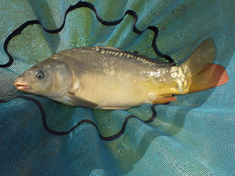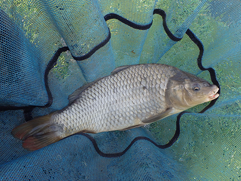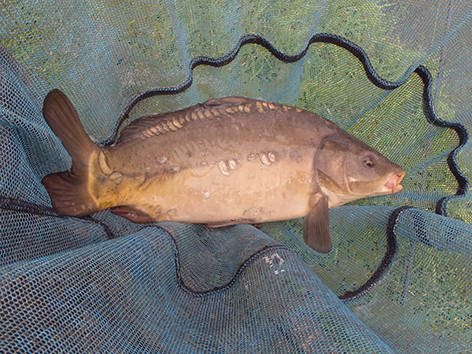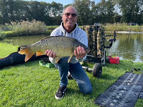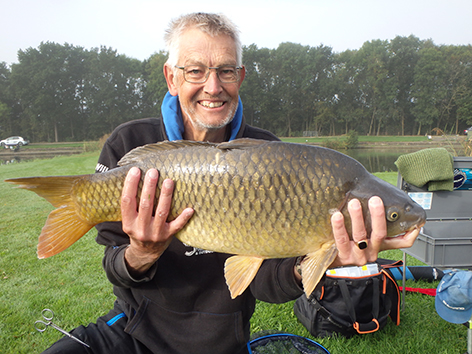 Maar dan is Willem op nummertje 63 al eventjes aan het drillen en we denken die heeft een vals gehaakte vis. Een vis dus die gehaakt is maar niet in zijn bek. Die vis laat Willem heel de vijver zien en zwemt zelfs om dat land tongetje heen waar hij haar dan eindelijk kan netten. Wat een prachtvis is dat dan.
