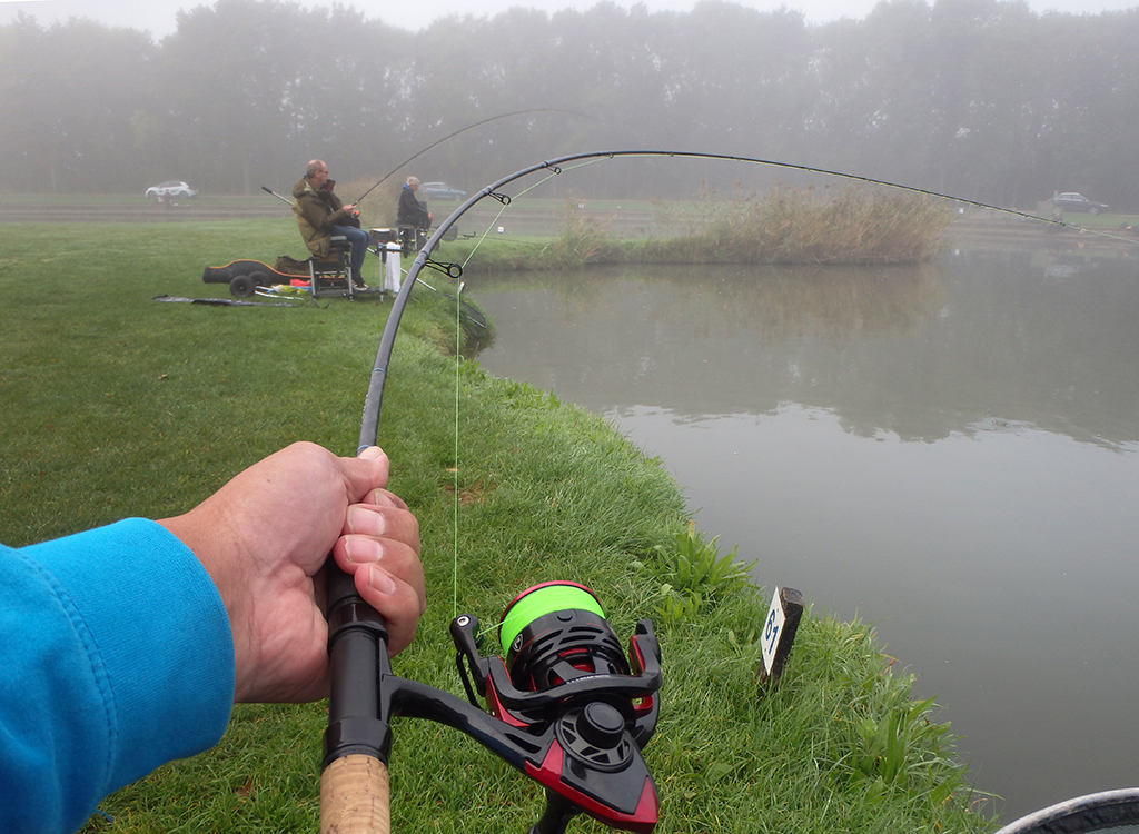 Natuurlijk de wet van Murphy. Doet je je hengel niet zekeren dan ben je die geheid kwijt. Er is een ondoordachtzaam moment met een praatje en ff naar links of rechts kijken, pellets schieten moet je toch met twee handen doen zo zijn er tal van seconden dat je ff niet je hengel in de gaten heb. Het is in een split second gebeurt met deze pellet visserij. De lijn staat bijna strak. Als de karper het zakkende aas pakt is dat direct en moet je alert zijn.