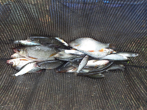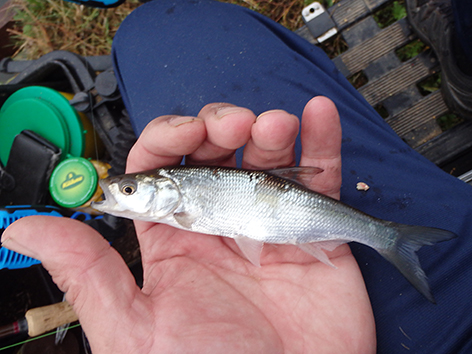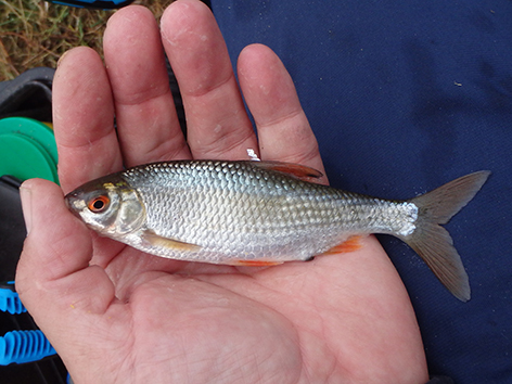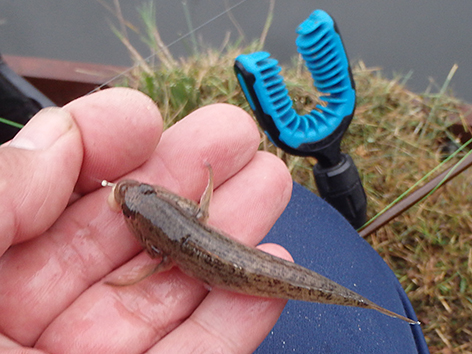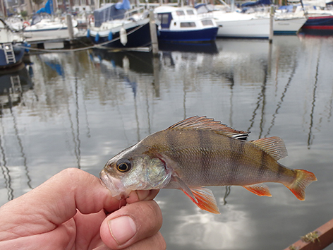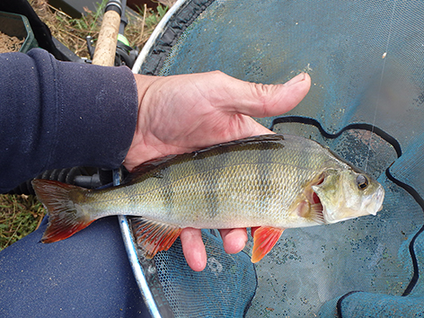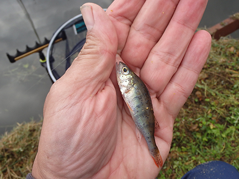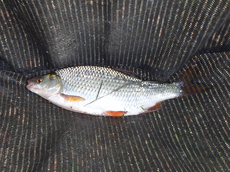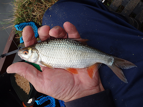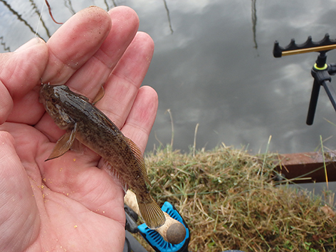 De eerste is een grondeltje. Ik vis staande haak dat is de haak net op de grond onder aan het taludje, maar als ik tegen het talud op loopt lig ik dus op de grond. Ik gaat schuiven en vis iets van de bodem af hogerop en dan gaat het goed en geregeld komt er nu voorn, winde, roofbleitjes als je je aas beweegt en baarsjes naar boven. De variëteit is weer groot vandaag. Van alles op de stek dus. Het is wachten op groter spul.