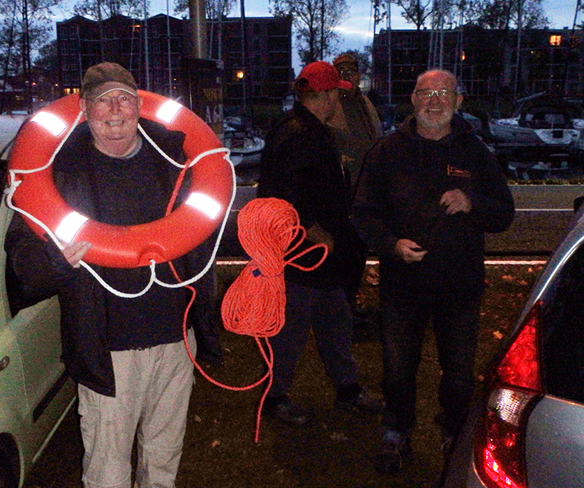 Ik weet dat Hans tegen een geintje kan dus kan het niet laten een reddingsboei mee te nemen woensdagochtend 8 oktober 2025 na het debacle van twee weken geleden. Vorige week was Hans er niet bij dus nu moest die met de billen bloot. Nee hoor die kan dat wel hebben. Vorige op week vakantie maar nu is die er weer bij. Vanmiddag naar het ziekenhuis om de pleisters van zijn benen af te halen zoals die zijn ingepakte benen laat zien. Nee dat heeft een aardig staartje gehad dus.