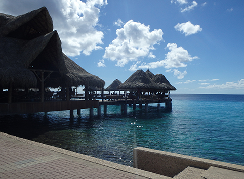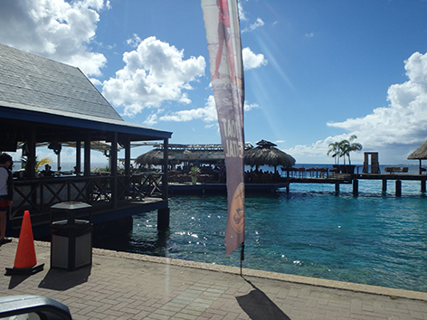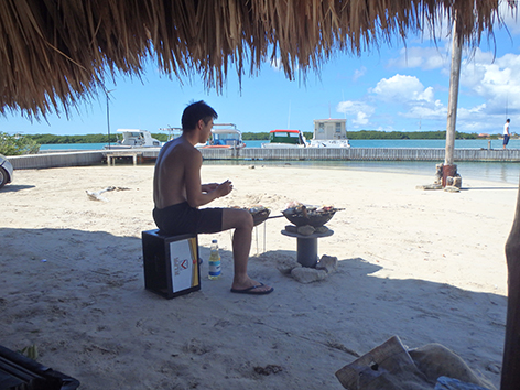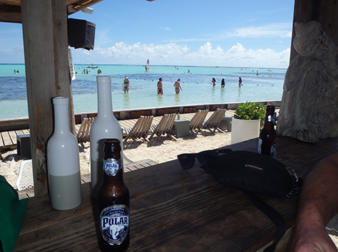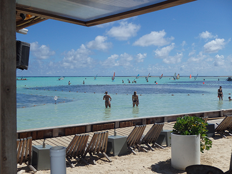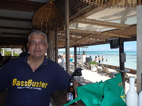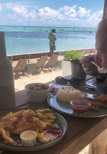 Het wordt dus een snapper soort met frietjes soort fish & chips en voor voor Marco barracuda met rijst weg gespoeld met dat lichte Polar bier. Heerlijk ook om daar te zitten. Staat een iemand op het strand muziek te draien. Gewoon een swingende tent aan het water. Met grote planten bedden in het water waar je niet doorheen mag lopen. Daar zit het helemaal vol met jonge visjes.
