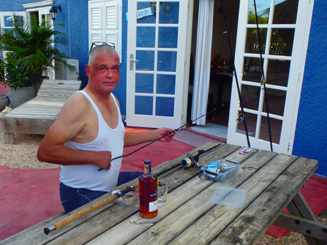 We hebben er zin an en na wat te hebben gegeten gaan we de hengels klaar maken.