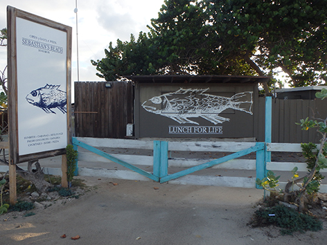 Het wordt dus een snapper soort met frietjes soort fish & chips en voor voor Marco barracuda met rijst weg gespoeld met dat lichte Polar bier. Heerlijk ook om daar te zitten. Staat een iemand op het strand muziek te draien. Gewoon een swingende tent aan het water. Met grote planten bedden in het water waar je niet doorheen mag lopen. Daar zit het helemaal vol met jonge visjes.