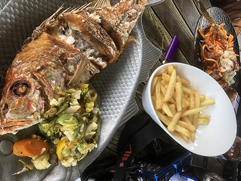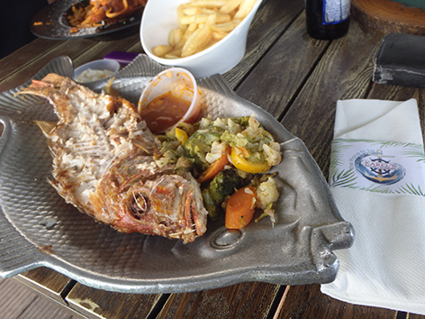 Hier kan ik dan eindelijk een red snapper bestellen. Dat is een heerlijke vis maar deze heeft veel te lang op de BBQ gelegen en is helemaal uitgedroogd. Wat een deceptie. Hoe kan je dit gerecht zo verknoeien.
