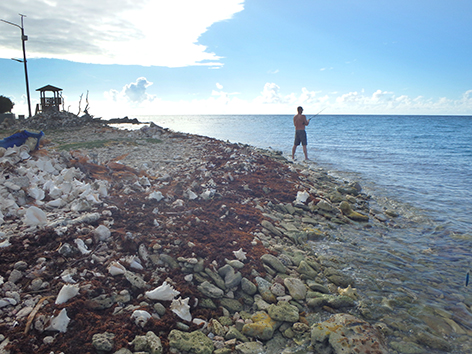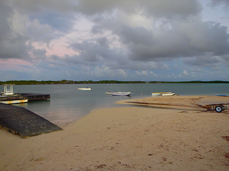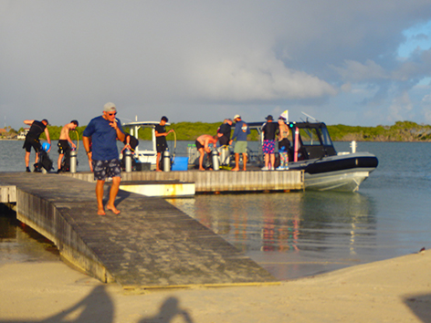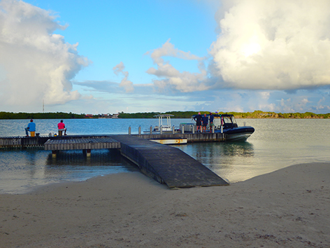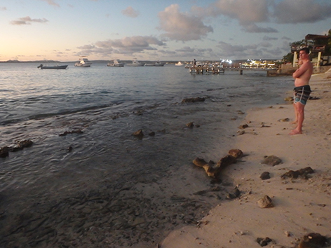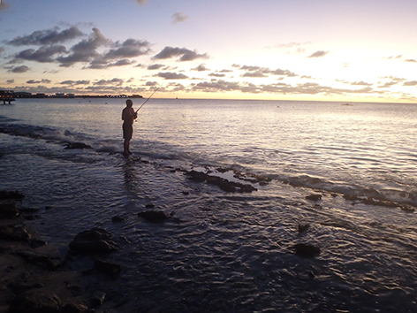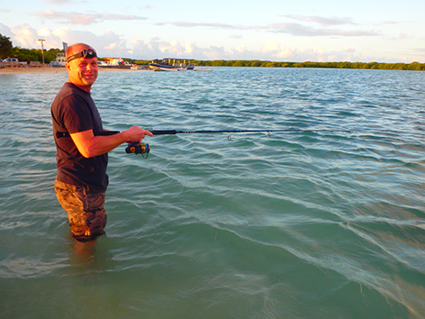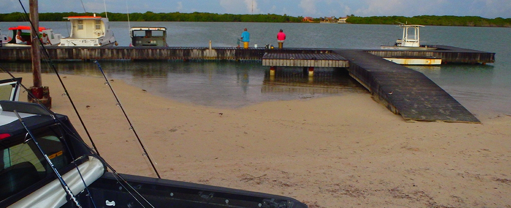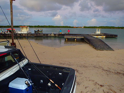 Dan staan we nog in het donker op de steiger van het haventje aan de zuid kant van Lac Bay op Sorobon Beach. Als we de hengels uitladen komt er nog een autootje aan en de man loopt gelijk naar de steiger met zijn hand lijnen en een emmer. Die zet die neer van; zo en hier zit ik altijd. Prima hoor aan de rechterkant is nog plek zat. Maar later snap ik de move. Want om zeven uur komt er een duikschool die er een boot trailerd en die dan daar aanlegt.