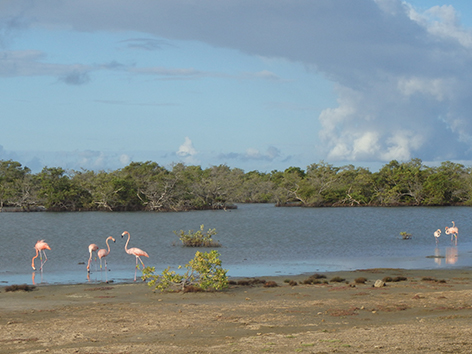 Die flamingo’s er ook nog een keertje op. Als we ’s middags terug rijden staan er bussen met toeristen en loopt er één flamingo te paraderen. Heel in de verte aan de overkant zitten ze dan bijna niet te zien.