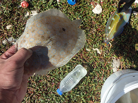 Iedereen vist eigenlijk met aas aan de haak en een loodje. De visjes zijn niet groot maar alles gaat vanavond met de rijst naar binnen. Maar dan zien we toch nog een aparte vis. Een platvis en die zijn te horen aan de meisjes en jongens wel heel speciaal om hier op Bonaire te vangen.