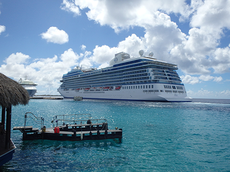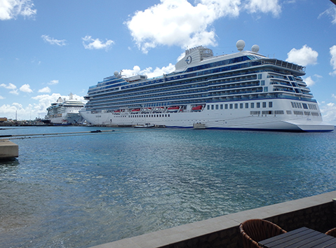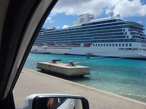 Als er cruiseschepen liggen is de boulevard gesloten voor autoverkeer. Dus moeten we er vanaf en de auto achter de huizen parkeren. Marco ken alle plekjes om dichtbij te parkeren. Want ik loop een beetje voor lul met twee kapotte schoenen. Men hoort me al van verre aanlopen met dat geklepper van de zolen. Zonder schoenen lopen is geen optie. We gaan zitten met uitzicht op de twee cruise schepen. Magnifiek nietwaar. Maar dan zegt Marco dat we ergens anders moeten gaan zitten. Hier komt zo die dieselbak aanleggen. Die rondvaart boot en die walmt dat wil je niet weten. Kijk daar hebben we wat aan als je hier al vele malen bent geweest. En jawel als we aan de andere kant zitten snap je niet dat die hier zomaar kan aanleggen terwijl je zit te eten. Wat een dieselstank komt er over die tafeltje s heen.