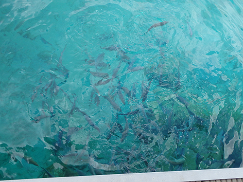 Ik krijg er drie keer een dikke dreun op hier op de steiger maar kan ze niet haken. Bij Marco ziet ik maar scholen kleine vissen springen van een centimeter of twaalf. Plakkaten van een paar vierkante meter dan bruist het gewoonweg en springen de visjes en halve meter uit het water. Duidelijk zie je dan zwarte dikke ruggen door het water heen knallen.