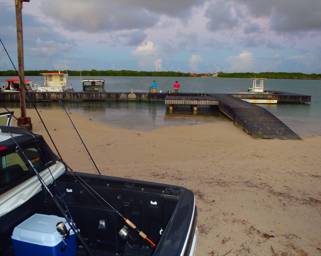 Dan staan we nog in het donker op de steiger van het haventje aan de zuid kant van Lac Bay op Sorobon Beach. Als we de hengels uitladen komt er nog een autootje aan en de man loopt gelijk naar de steiger met zijn hand lijnen en een emmer. Die zet die neer van; zo en hier zit ik altijd. Prima hoor aan de rechterkant is nog plek zat. Maar later snap ik de move. Want om zeven uur komt er een duikschool die er een boot trailerd en die dan daar aanlegt.