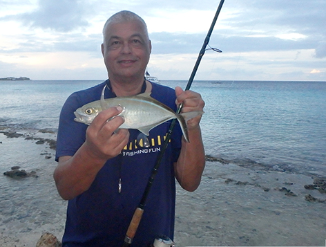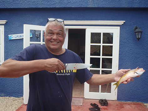 Maar dan komt er al filmend een dame van de duikschool met met koeien letters Crew op haar rug, de buren dus van ons aangelopen. Je mag hier helemaal niet vissen zegt ze en wij doen of we haar niet begrijpen maar ze is onverbiddelijk en houd aan. Weg wezen zegt ze snibbig. Wat een onaangenaam persoon is dat hoe die communiceert en de hele duik school staat te kijken en te filmen op de veranda. We gaan maar weg en we zullen navraag gaan doen natuurlijk. We hebben in ieder geval ons maaltje en daar ging het ons om. Dat is hier zo makkelijk te vangen om de hoek.