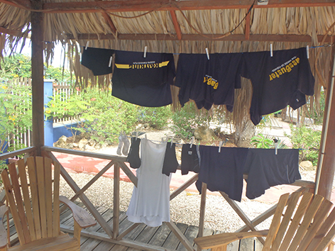 Je douchend met je kleren aan en kleed je dan uit. Nog wat van gisteren neem je mee onder de douche en je hangt het op. Een paar uur later is het droog.