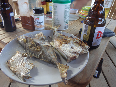 Eerst de visjes schoon maken en klaar zetten voor de BBQ vanavond. Dan gaan zo boodschappen doen want we hebben nog wel wat nodig.