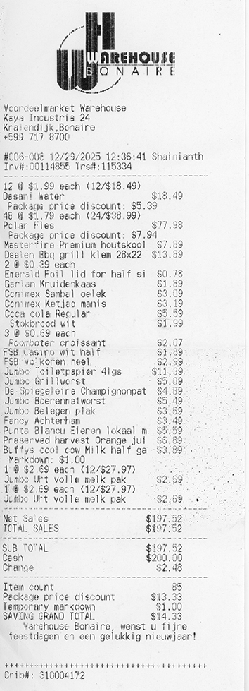 We hoorden van Maurits dat je je Polar bier moet halen bij de supermarkt naast de “onze”. Namelijk die chinese zaak Lucky Supermarket ook op Kaya Industria 28. Die is negen dollar per kratje goedkoper. Vanmorgen er net twee gehaald dus dat is voor volgende keer. Maar eens kijken voor boter. Zoek eigenlijk ook boter om de eitjes mee te bakken. Dat kan allemaal volgens die chinese jongen na er drie meiden eerst gesproken te hebben. Die hebben meer interesse in hun telefoon dan te helpen. Nu begrijp ik dat die winkel bijna leeg is qua mensen want die is zeker groter dan waar we normaal heen gaan en barstens vol goederen. De stellingen staan helemaal vol.. en dat is bij de buren wel anders.