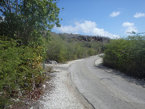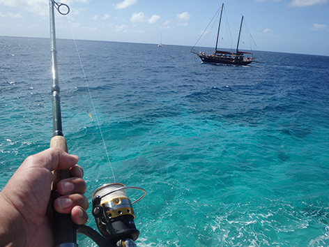 We doen wel een poging maar hoe halen we een grote gevangen vis hier naar boven. Wel kunnen we het diepere water hier bereiken met ons kunstaas. Een eindje verderop kan je veel lager komen bij het water en die spot missen we helemaal. Maar een paar dagen later komen we hier weer op aanraden van Maurits van Blanchi Koko die hier wel eens mensen heeft gezien die er vissen. Dat is goed te zien want het ligt er vol achtergelaten kluwen vislijnen. Je moet doorrijden tot een parkeerplek daar waar de duikers te water gaan vanaf de kant.