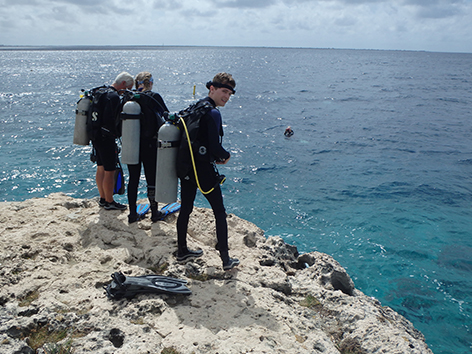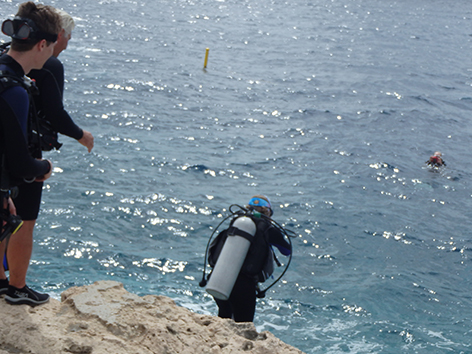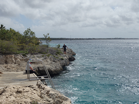 Als we het hebben gevonden herkennen we het wel. We hebben er vorige week een honderd meter verder ook gevist maar nu staan we bij een steigertje dichter bij het water. Van vissen komt niet want we zijn te laat. Het is er helemaal vol met duikers.