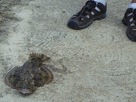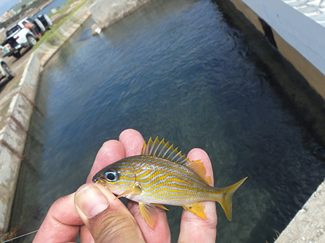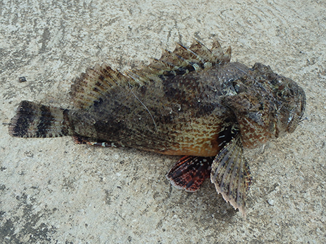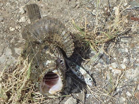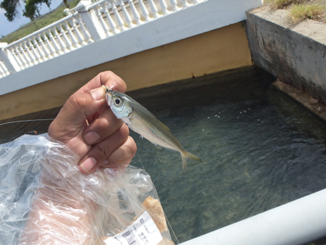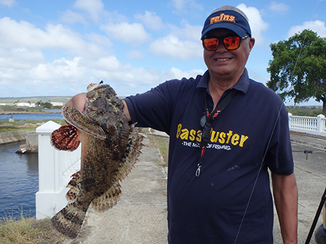 Maar na dik een uurtje aankloten heb ik dan toch eindelijk de eerste en gaat van haak wisselen. Aasvisje eraan en onder de balken gooien met een groot dropshot loodje. Zodat het visje net als de rest tegen de stroom in bijna stilstaat in zwemt. En jawel hoor al snel heb ik er iets aan hangen maar die wil je niet vangen. Alles wat er aan die vis zit is zwaar giftig en daar wordt je knap ziek van. Dan is je vakantie gedaan.