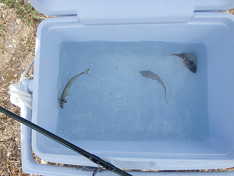 Met de overgebleven aasvisjes krijg ik geen beet meer terwijl ze vaak genoeg door de school visjes knallen maar in het helder water zien we dat ze mijn visje met haak gewoon negeren en de visjes er om heen zijn de sjaak. Wel weer zo’n gestekelde ridder. Dat dan weer wel dus uitkijken met onthaken. Ik heb net gewoon geluk gehad dat er meerdere tegelijkertijd door de school heen joegen en er eentje zich vergiste en mijn aasvisje met haak greep. We houden het voor gezin op deze stek. Het wordt ook knap warm we gaan richting strand waar in ieder geval een strak windje staat. We komen het zeker nog een keertje proberen want honderden visje die in de stroming staan en er zo af en toe van die grote vissen door knallen is alleen al een gaaf gezicht en dat allemaal op twee meter voor je voeten. Dan zie je dat er hel wat aanvallen moten gebeuren voordat die er wee eentje hebben.