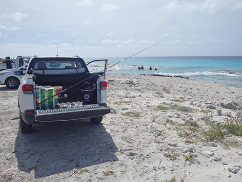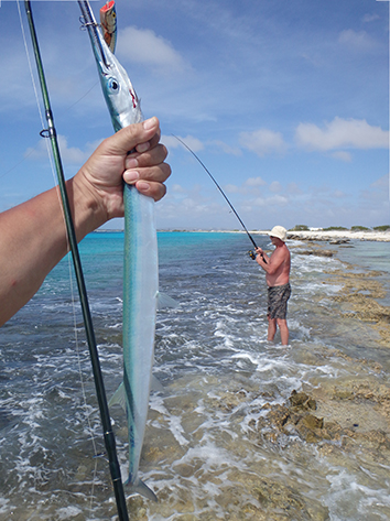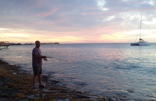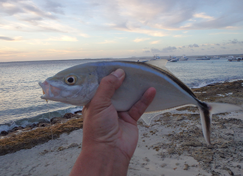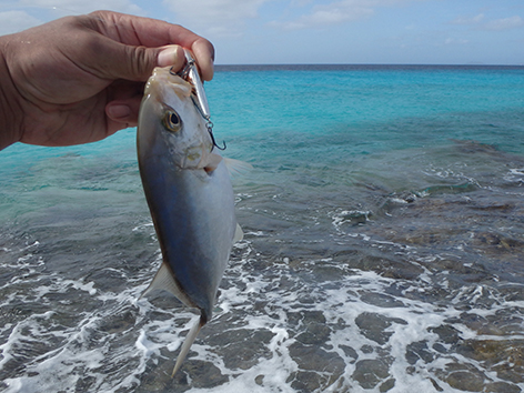 De dozen met pluggen zijn eigenlijk nog niet open geweest. Maar na tientallen gepen aanvallen en een veelal meer aan missers eindelijk een vis voor de BBQ vanavond ons avond eten want vandaag zal er niets open zijn op Bonaire.