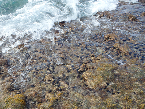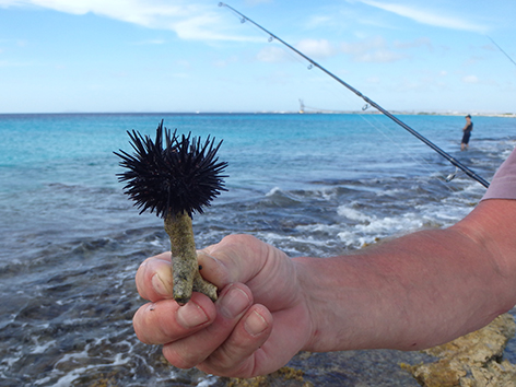 Daarom is goed schoeisel essentieel hier met vissen. En dat zou ik maar doen want als je per ongeluk op zon stekelige rakker stapt en die naalden door je zool van je schoen steken dan kan je de rest van je vakantie uitzieken na een bezoekje aan het ziekenhuis. Marco prikt een lege op een schelp om hem van dicht bij te laten zien.