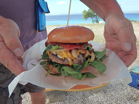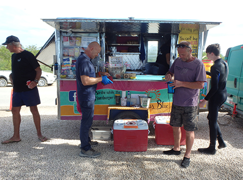 Jawel hoor de laatste twee en na ons worden klanten inderdaad weggestuurd. Hij heeft broodjes met beef en vis. Die vis is en plaag op Bonaire die eet het koraal op en heel veel broed en jonge vis. Hij steekt een heel verhaal op maar voor mij onbekende story dus komt die tot de conclusie dat ik dan beter de hamburger kan nemen. Zeker als ik dan hoor dat zo’n broodje 38 dollar kost. De twee broodje beef krijgen we voor 35,75 dollar. Marco die de pot vandaag bij zich heeft zegt gelijk van mij geen fooi dit jaar want heb een jaar geleden al gedoneerd voor je bruiloft. Ja ja, zeg ik dan het valt natuurlijk niet me om wat over te houden met deze prijzen voor een broodje. Maar vele malen horen we dat die broodjes de lekkerst zijn van heel Bonaire. Als ik vraag aan kokkie of ze er lang op heeft moeten oefenen zit daar toch jaren recherche in moet ze lachen.
