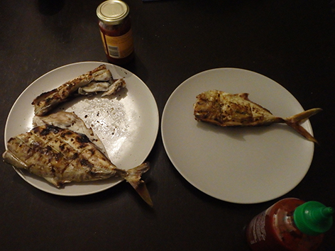 Dan toch ook nog wat voor ons avond maaltje ook. Daar zijn we intussen aan verslaafd geraakt. Heerlijk zo uit het water schoon maken en op het houtskool vuur. Veel lekkerder dan die droge zooi in een restaurant en we vergeten dan maar de groente en frietjes. We nemen wel een visje extra tot ons.