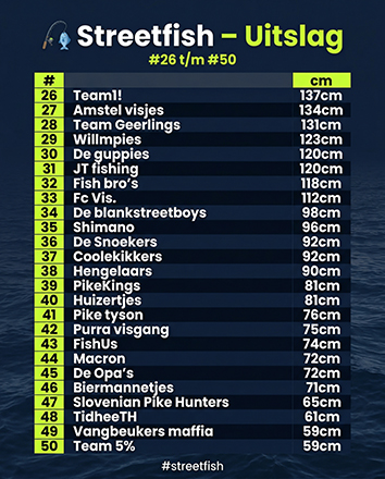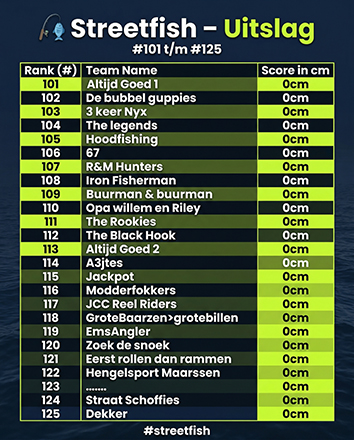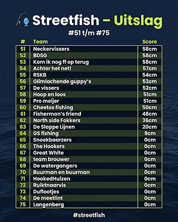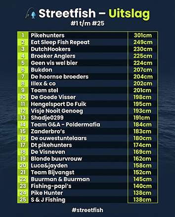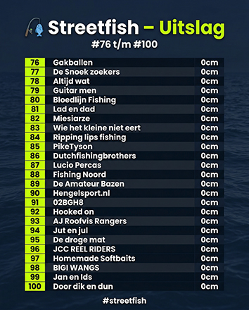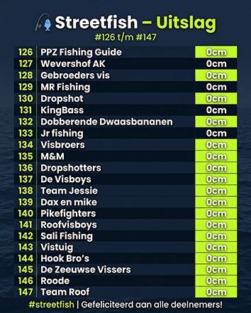 Namens Rien de Wolf Hengelsport: superbedankt voor jullie deelname aan de Streetfishing wedstrijd. We hopen dat jullie een topdag hebben gehad—mooie aanbeten, goede vibes langs de kant en (voor sommigen) nét die ene vis waar je de rest van de week over blijft opscheppen.