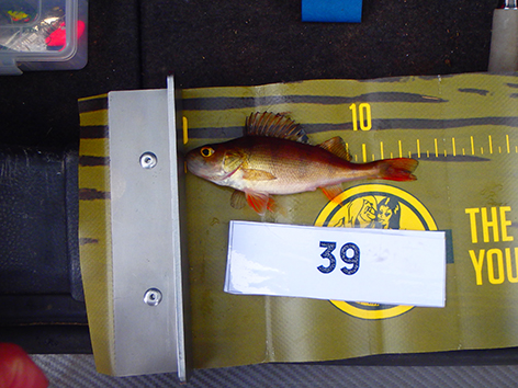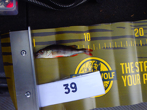 We blijven best wel lag hier hangen. Komt ook omdat we verschillende teams voorbij zien komen en die hebben nog niets gevangen. Ik heb hier een dikke snoek zien draaien die natuurlijk achter die baarsjes aan zit. en Wim probeert zo’n kleine gestreepte rakker te foppen.