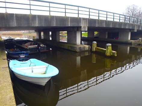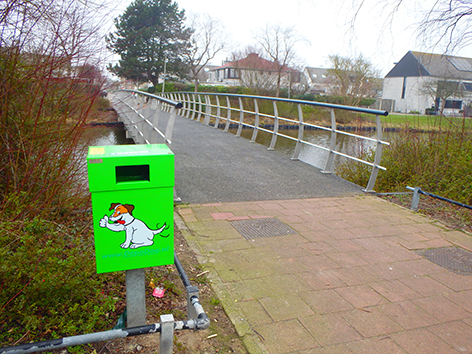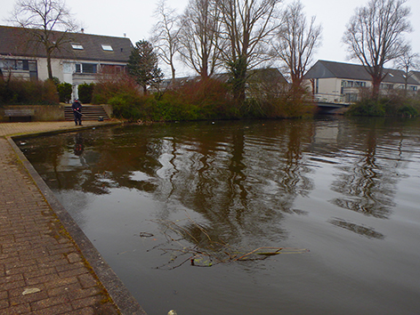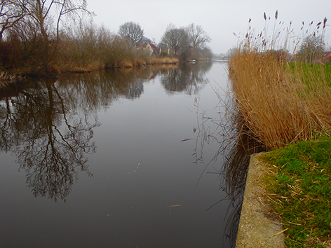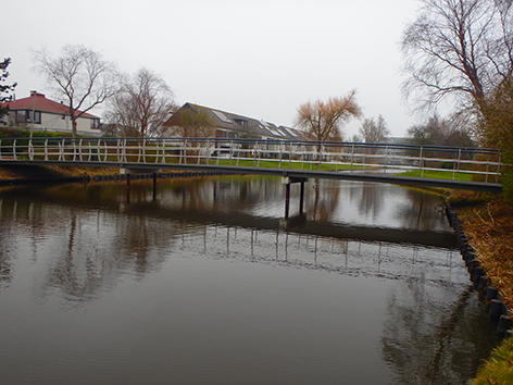 Langs het kanaaltje kunnen we niet trickeren. Er zijn ook maar weinig plekken waar je bij het water kan door die steile dijk. Denk dat de plekken waar je een vis zou kunnen netten gemaakt zijn door de honden. We lopen maar door naar die brug in de verte.