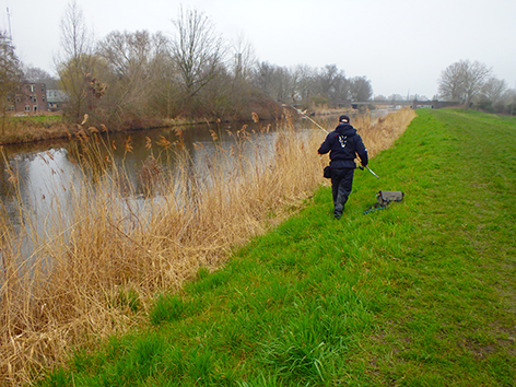 We vissen het af met langzaam kunstaas maar we kunnen niets trickeren. Dan maar weer naar een kanaaltje met bruggetjes voor het laatste uurtje. We spreken iemand die de hond uit laat en best wilde meedoen maar met zoveel mensen. Nee ik vis vaak even ’s avonds na het werk hier in de wijk maar dat wil allemaal niet lukken de laatste tijd. Misschien aan het einde van de straat in het “kanaal”. Dan maar weer aan de wandel.