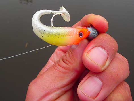 Ik krijg tikkies op mijn spinnertje zegt Wim dan. Met daarna volgers van hele kleine baarsjes. Ik vis met wat groter aas om een snoekje te verlijden en ziet dan dat hele kleine baars ook mijn kraaltje en stoppertje aanvallen op nog geen halve meter uit de kant. Ik heb die ingenieuze onderlijn gefriemel om snel te kunnen wisselen van dropshot naar carolina- of texas rig, plugje of shadje. Zo hoef ik maar één hengel mee te sjouwen.
