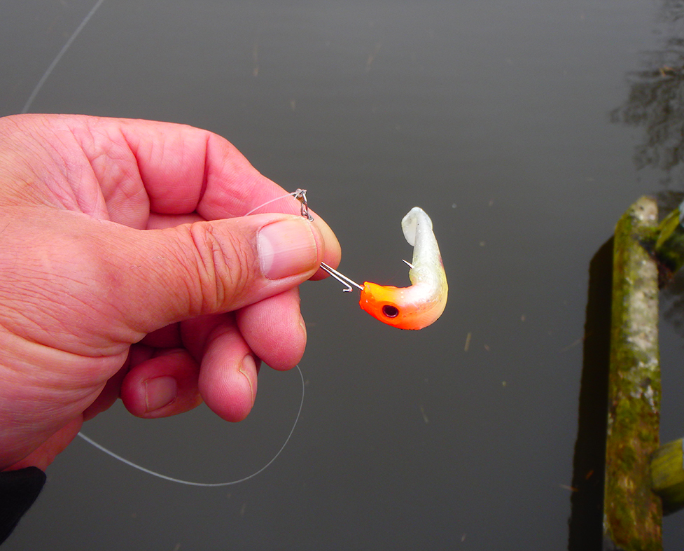 Ik krijg tikkies op mijn spinnertje zegt Wim dan. Met daarna volgers van hele kleine baarsjes. Ik vis met wat groter aas om een snoekje te verlijden en ziet dan dat hele kleine baars ook mijn kraaltje en stoppertje aanvallen op nog geen halve meter uit de kant. Ik heb die ingenieuze onderlijn gefriemel om snel te kunnen wisselen van dropshot naar carolina- of texas rig, plugje of shadje. Zo hoef ik maar één hengel mee te sjouwen.