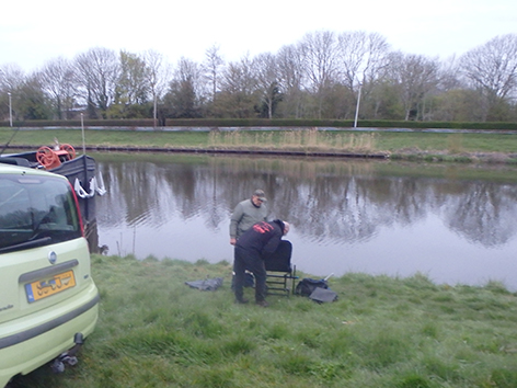De uitslag van vandaag wordt al beter. Als het water opwarmt en voor volgende week ziet dat er goed uit. De nachtvorst lijkt eindelijk voorbij. Dan zal het gelijk een stuk beter en vooral aangenamer zijn om te vissen. Voor volgende week mag Gerbrand kiezen waar te vissen. Dat zal weer hier zijn want zo uit de auto vissen, een mooi vlak stuk waar die kan zitten, vandaag hier tweede geworden met drie platten. Waarom ergens anders vissen en gelijk heeft die natuurlijk. Ik opper nog als je nu mag kiezen waar we gaan vissen waarom mag diegene die aan de beurt is ook zijn stek nummer niet kiezen. Want ik heb dat wel meegemaakt laatste worden op de stek die je heb gekozen vanwege het trekken van het slechtste plekkie. Zo ook vandaag natuurlijk Fred. Maar nee daar is geen animo voor.