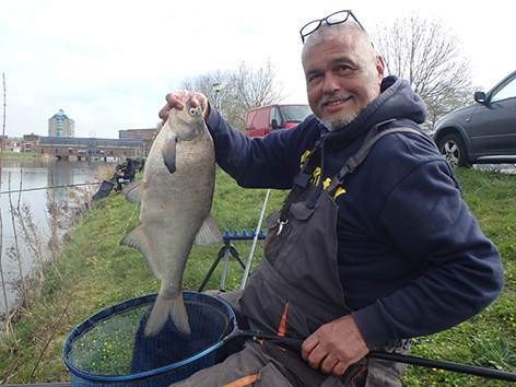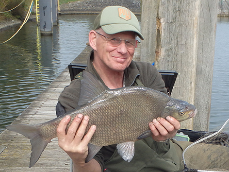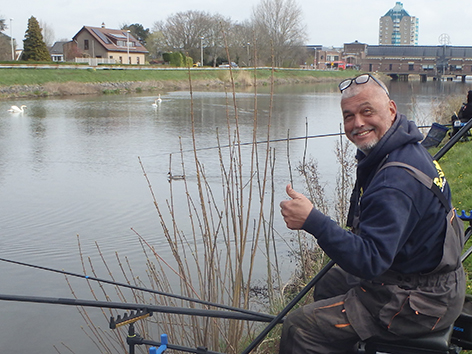 Ik vang nu regelmatig vis maar allemaal van dat kleine spul. Groot aas het maakt niet uit en zit ook al snel aan de twintig met maar één mooie winde van een dikke twintig centimeter. Als dan Joep naast me komt staan die gisteren terug gekomen is van een fietsvakantie in Spanje. Dan duikt mijn dobbertje onder aan het einde van mijn drift en gelijk het elastiek er meters uit. Hèhè een dik half uurtje voor de fluit.