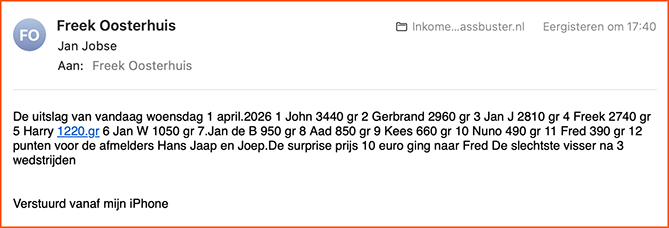 Fred met 390gram is toch nog een beetje de winnaar want er was een prijs van tien eurootjes voor degene die tot vandaag de minste vis heeft gevangen en alle wedstrijden meegedaan.