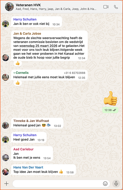 Ik stap onder de douche maar Jan heeft de andere commissieleden gebeld en we slaan deze wedstrijd over hoor ik dan als ik mijn oren leeg schept.