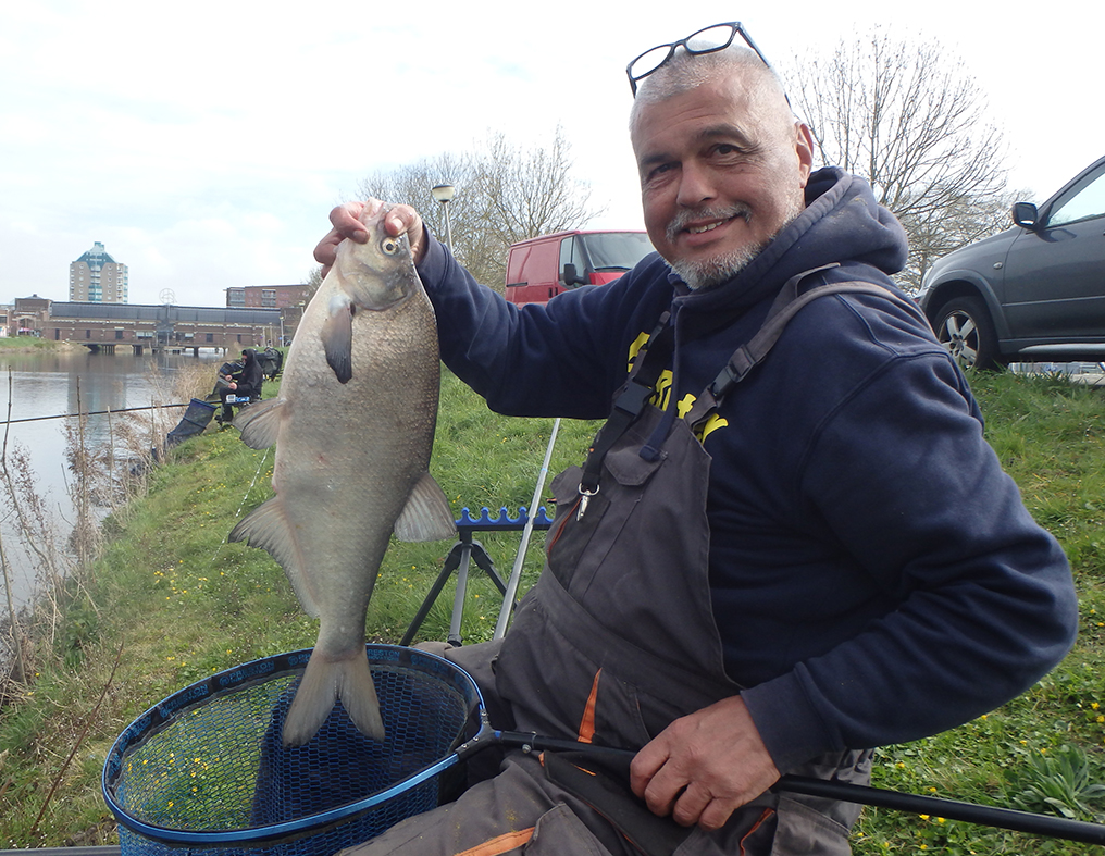 Ik vang nu regelmatig vis maar allemaal van dat kleine spul. Groot aas het maakt niet uit en zit ook al snel aan de twintig met maar één mooie winde van een dikke twintig centimeter. Als dan Joep naast me komt staan die gisteren terug gekomen is van een fietsvakantie in Spanje. Dan duikt mijn dobbertje onder aan het einde van mijn drift en gelijk het elastiek er meters uit. Hèhè een dik half uurtje voor de fluit.