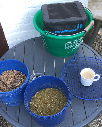 Als ik dan in een klein uurtje al acht platten heb liggen is Jan klaar met de vaste stok. Die vangt alleen maar kleine roofbleitjes. De vis zit zeker aan de overkant zegt die dan en gaat zijn feeder uitpakken.
