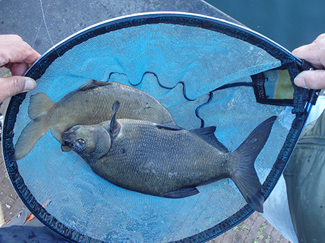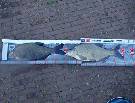 Dan wordt het druk en gaat vissen met één hengel. Om de beurt de linker of de rechter voer gebruiken. Het is ingooien. Strak trekken en vaak hoeft dat niet eens. Lijkt wel of ze er op zitten te wachten. Die horen net als in de commercials bij die karpertjes de voerkorf waarschijnlijk al vallen en duiken er massaal op. De vis drillen neemt de meeste tijd in beslag. Wat een visserij.
