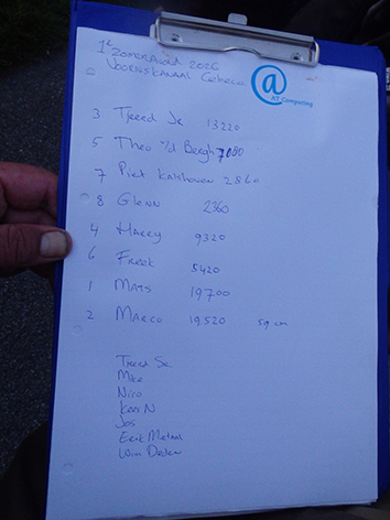 We zitten met een klein ploegje de eerste wedstrijd. Tjeerd Sr, Mike, Nico KeesN Jos Erik en Wim zijn er niet bij vanmiddag. Rechts van me dus Mats, daarnaast zit Piet, dan Theo, Glen en Marco zit op de kop. Aan de andere kant van me zitten dan Harry en Tjeerd heeft het staartnummer.