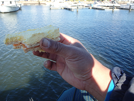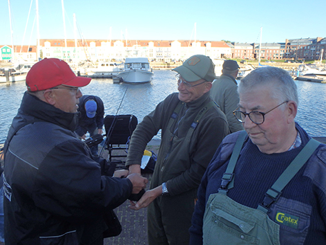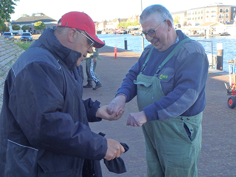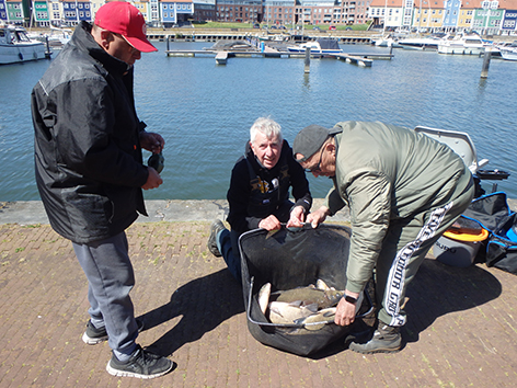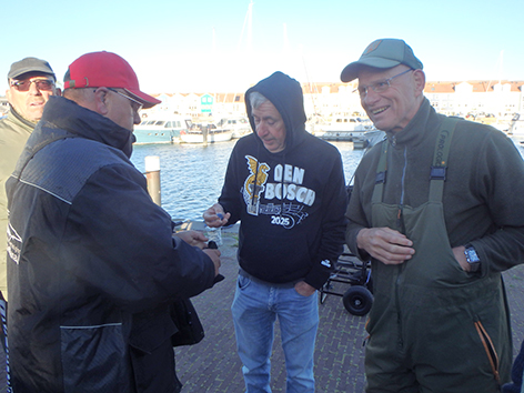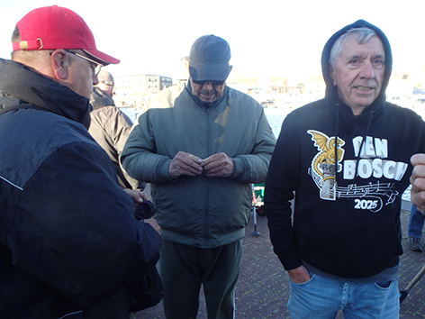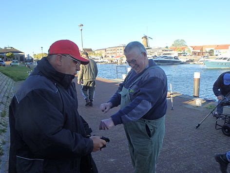 Met die wind moet je zorgen dat er altijd druk op de lijn staat. Valt dat eventjes weg en gaat je draaien aan de molen dan met die wind wil dat wel eens fout gaan. Wat zeg ik dat gaat zeker fout. Dan komt er een los stukje lijn op de molen zoveel dat er soms een lusje ontstaat en dan gooi je bij de volgende worp zekers een pruik. Zeker met gevlochten lijn is dat zo. Gelukkig bij Gerbrand die heeft nylon lijn is alleen de lijn achter de spoel terecht gekomen en die slaat dan om het asje heen van de molen. Jat lost mijn andere buurman wel even op want Jan Wulffraat heeft net het molentje van Ger gereviseert en een nieuwe lijn op de spoel gezet. En tijdens die werkzaamheden heeft er een grondel zijn aas gevonden. Zodoende is Gerbrand de eerste vandaag met wat bij te wegen aan te bieden. Die is van de nul af.