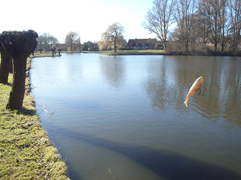 We hebben een rondje uitgestippeld en dachten dat met die koude nachten de vis nog wel diep zou liggen en vissen langs het Kanaal door Voorne op de welbekende stekken. Maar toch doen we aan de overkant de vesting gracht nog eventjes aan. Op dat ondiepe water denk je dan daar zal de vis wel ingegraven op de bodem liggen. Wim begint aan de noordkant en ik aan de zuidkant van Land van Paling. Dan is de bedoeling dat we naar elkaar toelopen en dan voorbij met ieder een ander soort kunstaas en zo de vijver af te vissen.