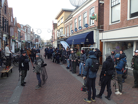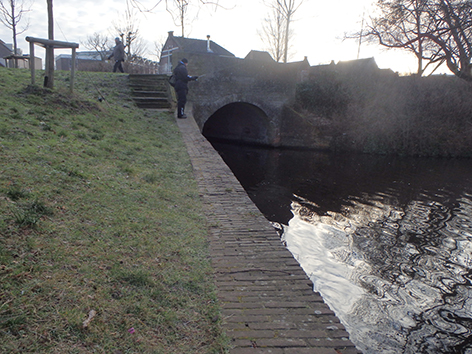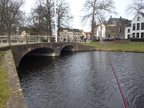 Wat een drukte plotseling bij de brug. Dus gaan wij maar weer terug richting de bebouwde kom. Want het is hier koud, heel koud in dat windje langs het kanaal. Dus naar die vestinggracht uit die koude wind. Ik heb daar een aanbeet gemist en misschien is die dikke dame dat nu alweer vergeten. Maar we hebben pech. Daar staat een koppel en die hebben de dikke snoek net terug gezet.