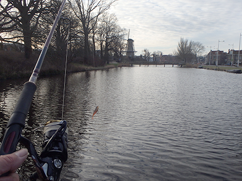 Dan verlaten we de vestinggracht en gaan vissen op nog ondieper en kleiner water midden in de wijk. Het laatste uurtje gaat beginnen dus maar een noodsprong en gokken op het geluk van Wim. Als we niet in het eerste uur een snoek vangen dan heeft altijd nog Wim in het allerlaatste uur het geluk aan zijn kont hangen de laatste wedstrijden. Tot nu toe dan.