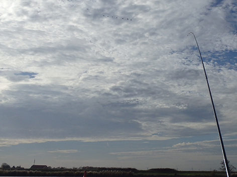 Maar het is nog niet wild. Wel moet ik de uitgezette 35 meter vol uitgooien want land de zware 70grams korf gekregen van Joep een paar meter te vroeg zit ik geheid muurvast. Het is nog ff wennen met die zware korven smijten met die heavy stokken.